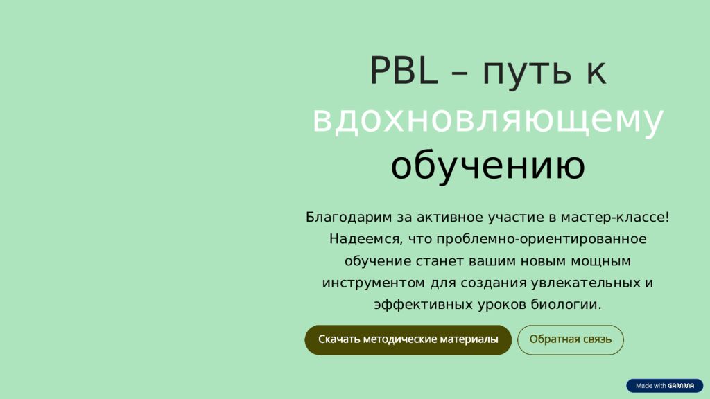 PBL – путь к вдохновляющему обучению Благодарим за активное участие в мастер-классе! Надеемся, что проблемно-ориентированное обучение станет вашим новым мощным инструментом для создания увлекательных и эффективных уроков биологии.