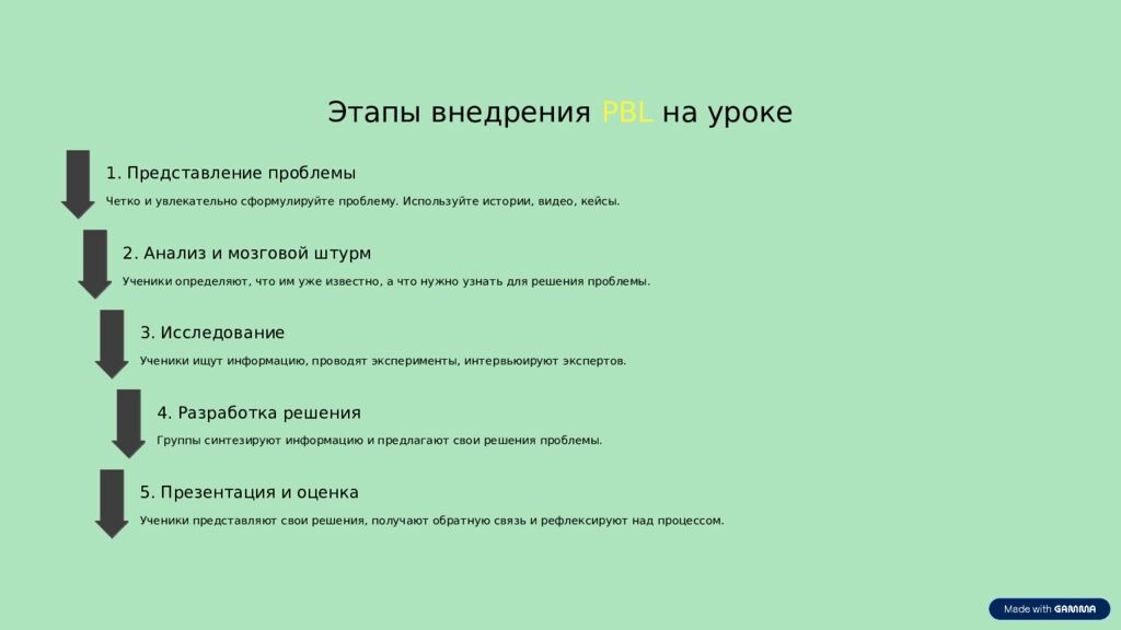 Этапы внедрения PBL на уроке 1. Представление проблемы Четко и увлекательно сформулируйте проблему. Используйте истории, видео, кейсы. 2. Анализ и мозговой штурм Ученики определяют, что им уже известно, а что нужно узнать для решения проблемы. 3. Исследование Ученики ищут информацию, проводят эксперименты, интервьюируют экспертов. 4. Разработка решения Группы синтезируют информацию и предлагают свои решения проблемы. 5. Презентация и оценка Ученики представляют свои решения, получают обратную связь и рефлексируют над процессом.