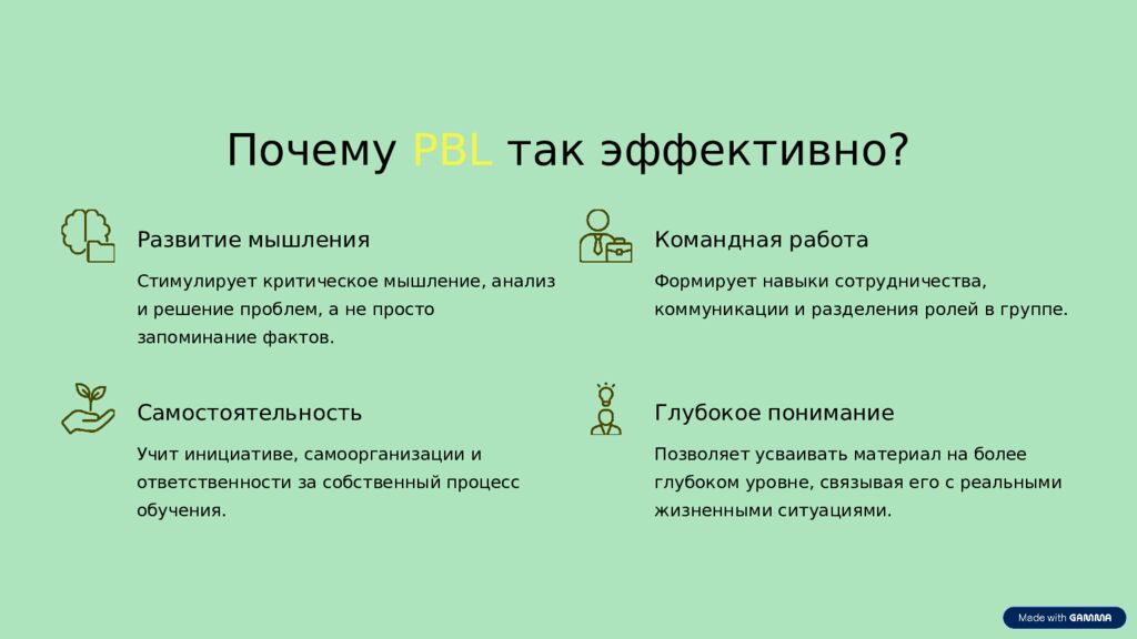 Почему PBL так эффективно? Развитие мышления Стимулирует критическое мышление, анализ и решение проблем, а не просто запоминание фактов. Командная работа Формирует навыки сотрудничества, коммуникации и разделения ролей в группе. Самостоятельность Учит инициативе, самоорганизации и ответственности за собственный процесс обучения. Глубокое понимание Позволяет усваивать материал на более глубоком уровне, связывая его с реальными жизненными ситуациями.