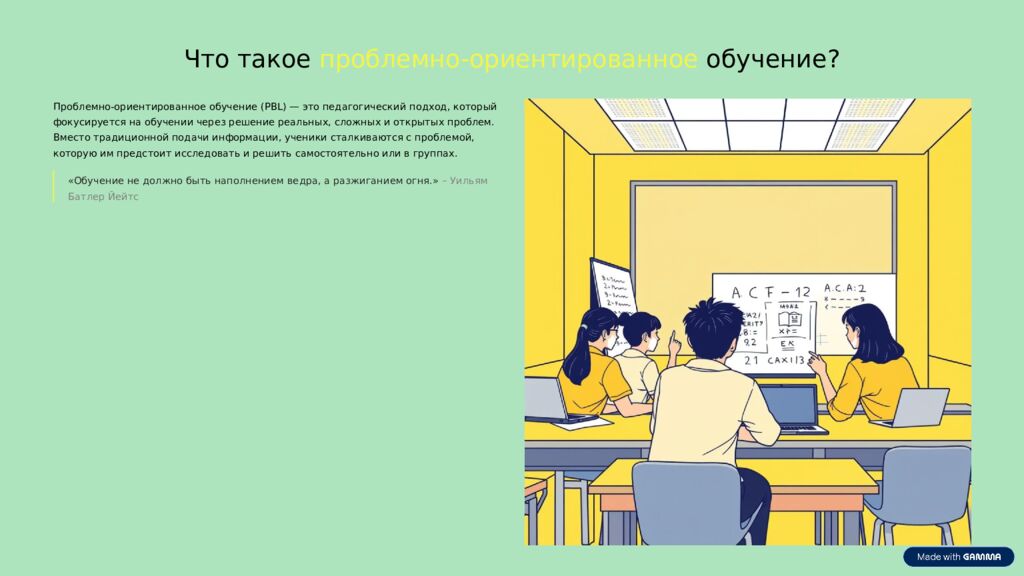 Что такое проблемно-ориентированное обучение? Проблемно-ориентированное обучение (PBL) — это педагогический подход, который фокусируется на обучении через решение реальных, сложных и открытых проблем. Вместо традиционной подачи информации, ученики сталкиваются с проблемой, которую им предстоит исследовать и решить самостоятельно или в группах. «Обучение не должно быть наполнением ведра, а разжиганием огня.» – Уильям Батлер Йейтс
