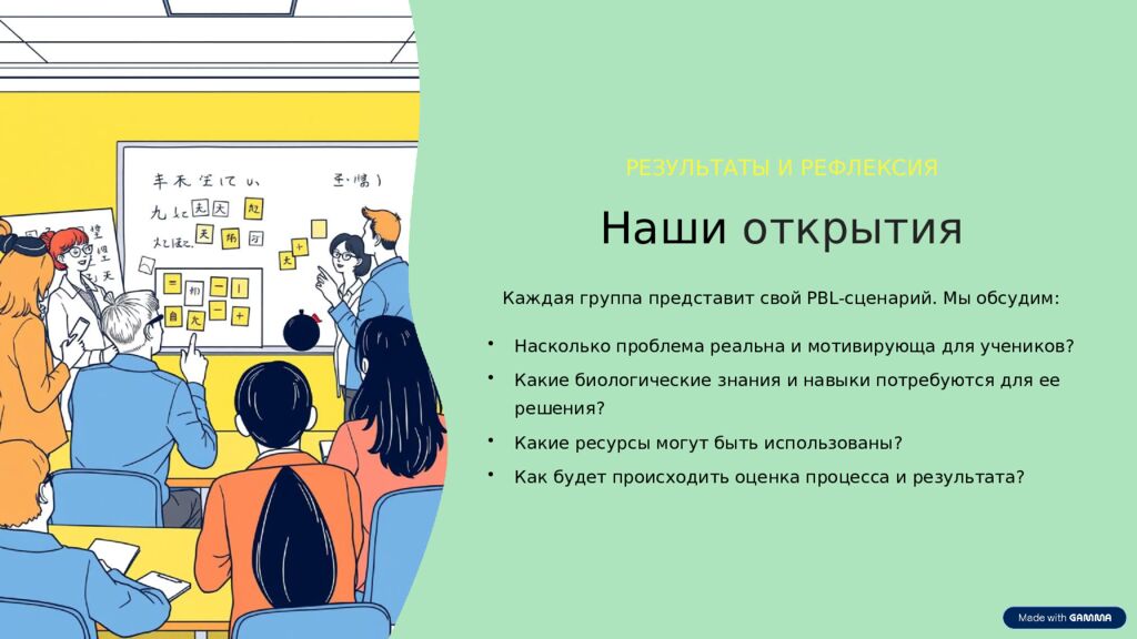 РЕЗУЛЬТАТЫ И РЕФЛЕКСИЯ Наши открытия Каждая группа представит свой PBL-сценарий. Мы обсудим: Насколько проблема реальна и мотивирующа для учеников? Какие биологические знания и навыки потребуются для ее решения? Какие ресурсы могут быть использованы? Как будет происходить оценка процесса и результата?