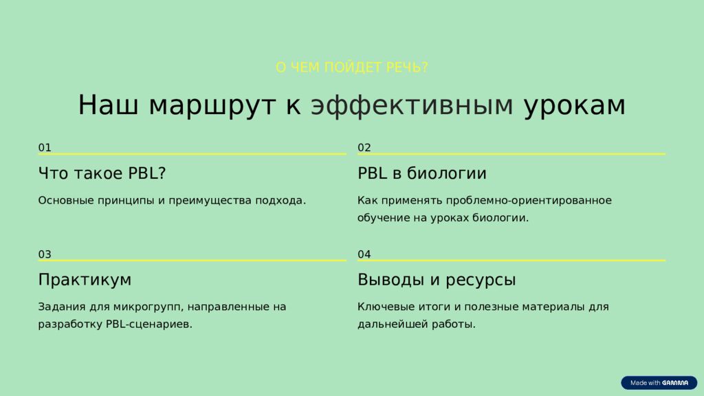 О ЧЕМ ПОЙДЕТ РЕЧЬ? Наш маршрут к эффективным урокам 01 Что такое PBL? Основные принципы и преимущества подхода. 02 PBL в биологии Как применять проблемно-ориентированное обучение на уроках биологии. 03 Практикум Задания для микрогрупп, направленные на разработку PBL-сценариев. 04 Выводы и ресурсы Ключевые итоги и полезные материалы для дальнейшей работы.