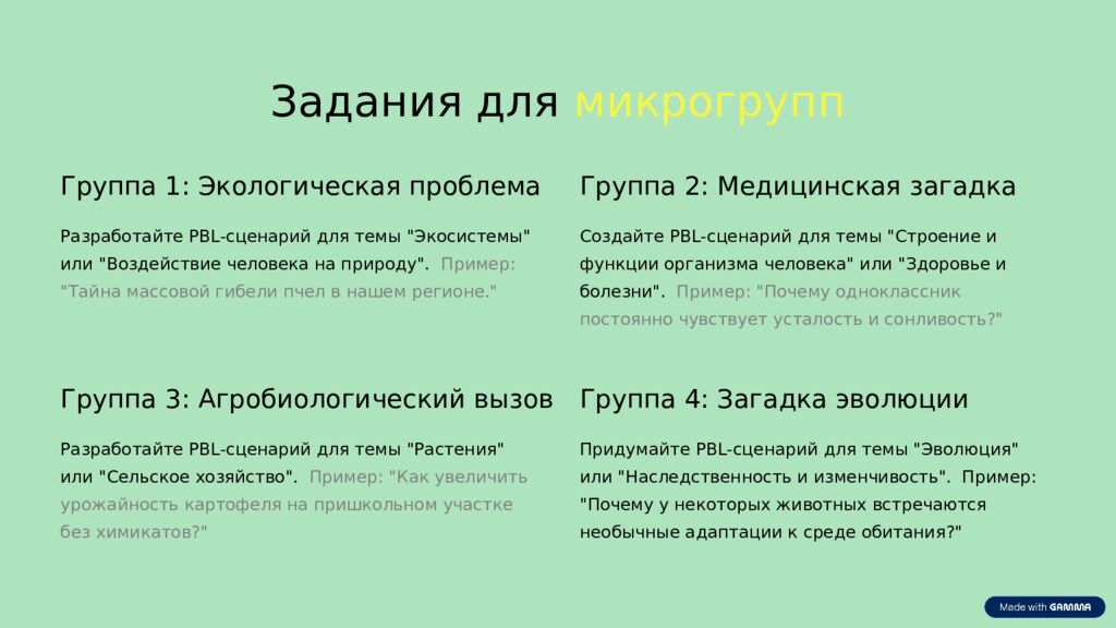 Задания для микрогрупп Группа 1: Экологическая проблема Разработайте PBL-сценарий для темы "Экосистемы" или "Воздействие человека на природу". Пример: "Тайна массовой гибели пчел в нашем регионе." Группа 2: Медицинская загадка Создайте PBL-сценарий для темы "Строение и функции организма человека" или "Здоровье и болезни". Пример: "Почему одноклассник постоянно чувствует усталость и сонливость?" Группа 3: Агробиологический вызов Разработайте PBL-сценарий для темы "Растения" или "Сельское хозяйство". Пример: "Как увеличить урожайность картофеля на пришкольном участке без химикатов?" Группа 4: Загадка эволюции Придумайте PBL-сценарий для темы "Эволюция" или "Наследственность и изменчивость". Пример: "Почему у некоторых животных встречаются необычные адаптации к среде обитания?"