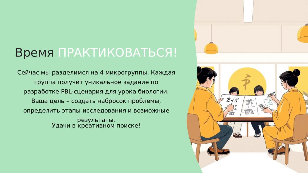 Время ПРАКТИКОВАТЬСЯ! Сейчас мы разделимся на 4 микрогруппы. Каждая группа получит уникальное задание по разработке PBL-сценария для урока биологии. Ваша цель – создать набросок проблемы, определить этапы исследования и возможные результаты. Удачи в креативном поиске!