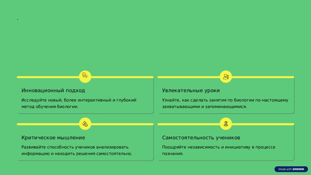 . Инновационный подход Исследуйте новый, более интерактивный и глубокий метод обучения биологии. Увлекательные уроки Узнайте, как сделать занятия по биологии по-настоящему захватывающими и запоминающимися. Критическое мышление Развивайте способность учеников анализировать информацию и находить решения самостоятельно. Самостоятельность учеников Поощряйте независимость и инициативу в процессе познания.