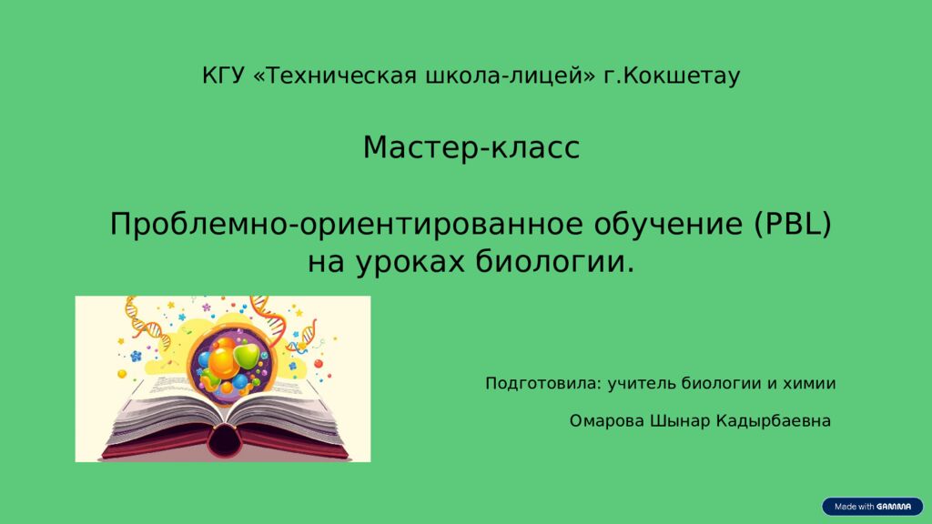 КГУ «Техническая школа-лицей» г.Кокшетау Мастер-класс Проблемно-ориентированное обучение (PBL) на уроках биологии. Подготовила: учитель биологии и химии Омарова Шынар Кадырбаевна