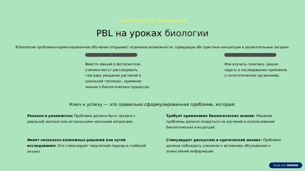 ПРАКТИЧЕСКОЕ ПРИМЕНЕНИЕ PBL на уроках биологии В биологии проблемно-ориентированное обучение открывает огромные возможности, превращая абстрактные концепции в увлекательные загадки. Вместо лекций о фотосинтезе, ученики могут расследовать «загадку увядания растений в школьной теплице», применяя знания о биологических процессах. Или изучать генетику, решая задачу о наследовании признаков у гипотетических организмов. Ключ к успеху — это правильно сформулированная проблема, которая: Реальна и релевантна: Проблема должна быть связана с реальной жизнью или актуальными научными вопросами. Требует применения биологических знаний: Решение проблемы должно опираться на изучение и использование биологических концепций. Имеет несколько возможных решений или путей исследования: Это стимулирует творческий подход и глубокий анализ. Стимулирует дискуссию и критический анализ: Проблема должна побуждать учеников к активному обсуждению и осмыслению информации.