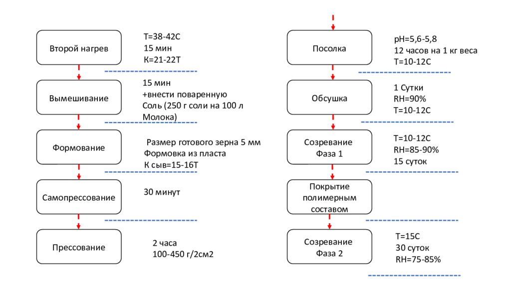 Второй нагрев Вымешивание Формование Самопрессование Прессование Т=38-42С 15 мин К=21-22Т 15 мин +внести поваренную Соль (250 г соли на 100 л Молока) Размер готового зерна 5 мм Формовка из пласта К сыв =15-16Т 30 минут Посолка Обсушка Созревание Фаза 1 Покрытие полимерным составом Созревание Фаза 2 pH=5,6-5,8 12 часов на 1 кг веса Т=10-12С 1 Сутки RH =90% Т=10-12С Т=10-12С RH= 85-90% 15 суток 2 часа 100-450 г/2см2 Т=15С 30 суток RH= 75-85%