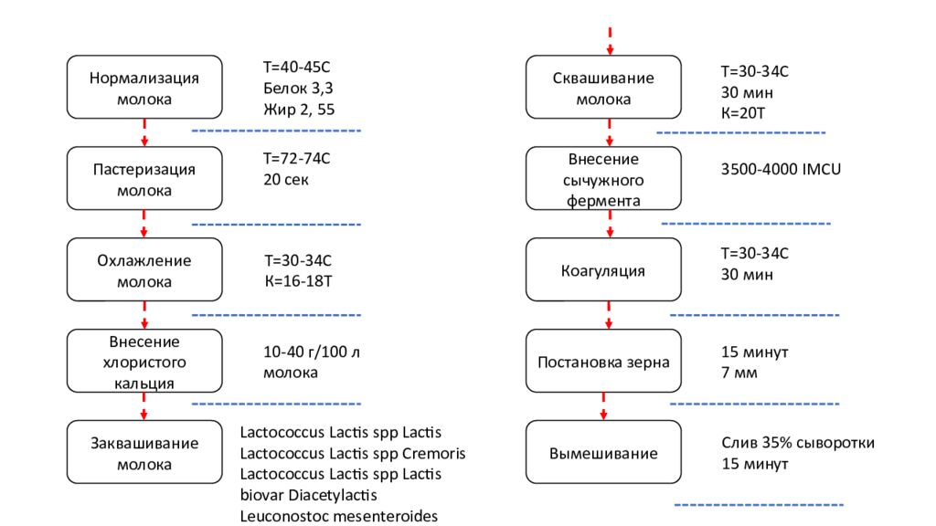 Нормализация молока Пастеризация молока Охлажление молока Внесение хлористого кальция Заквашивание молока Сквашивание молока Внесение сычужного фермента Коагуляция Постановка зерна Вымешивание Т=40-45С Белок 3,3 Жир 2, 55 Т=72-74С 20 сек Т=30-34С К=16-18Т 10-40 г/100 л молока Lactococcus Lactis spp Lactis Lactococcus Lactis spp Cremoris Lactococcus Lactis spp Lactis biovar Diacetylactis Leuconostoc mesenteroides Т= 30 - 3 4С 30 мин К=20Т 3500-4000 IMCU Т= 30 - 3 4С 30 мин 15 минут 7 мм Слив 35% сыворотки 15 минут