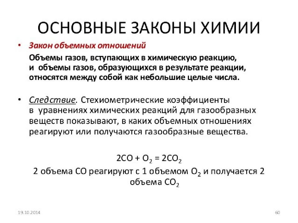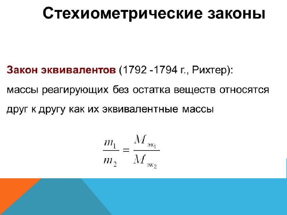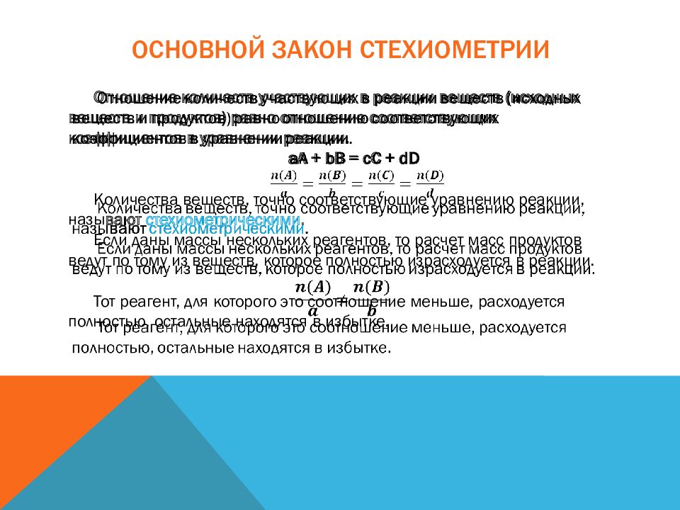 Отношение количеств участвующих в реакции веществ (исходных веществ и продуктов) равно отношению соответствующих коэффициентов в уравнении реакции. aA + bB = cC + dD Количества веществ, точно соответствующие уравнению реакции, назы вают стехиометрическими. Если даны массы нескольких реагентов, то расчет масс продуктов ведут по тому из веществ, которое полностью израсходуется в реакции. Тот реагент, для которого это соотношение меньше, расходуется полностью, остальные находятся в избытке.
