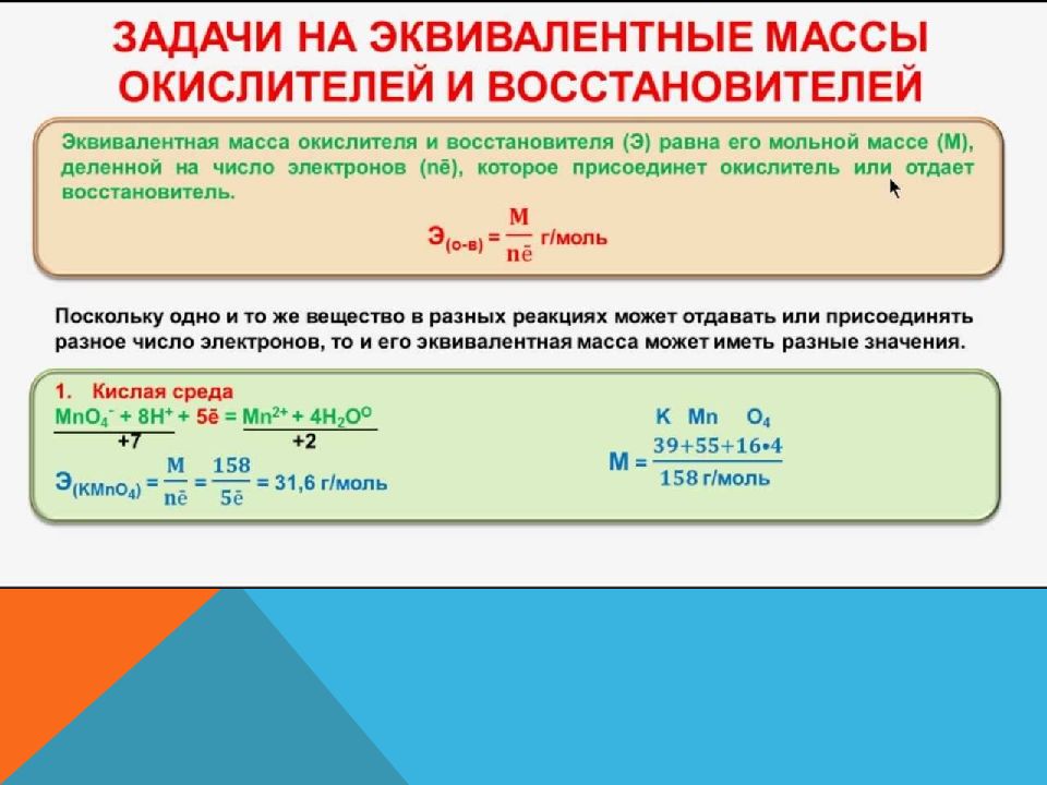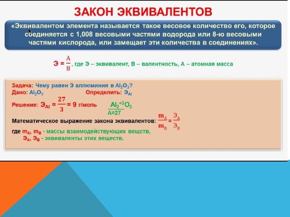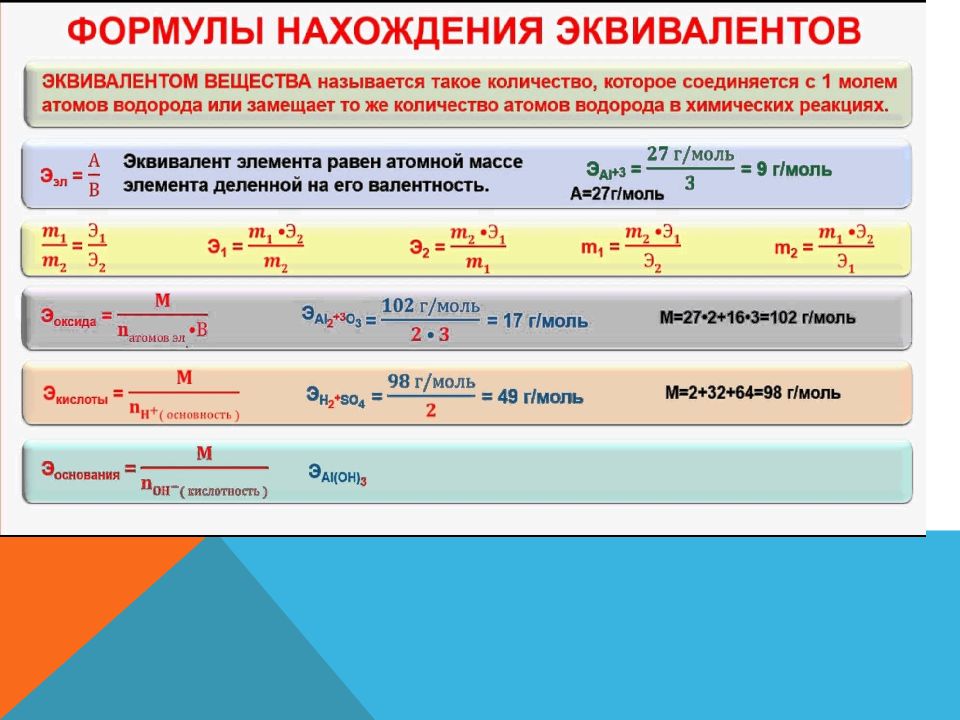 Масса 1 моля вещества эквивалента ( 1/ z ) X называется молярной массой эквивалента и представляет собой отношение массы вещества Х к количеству вещества эквивалента ( 1/ z ) X.