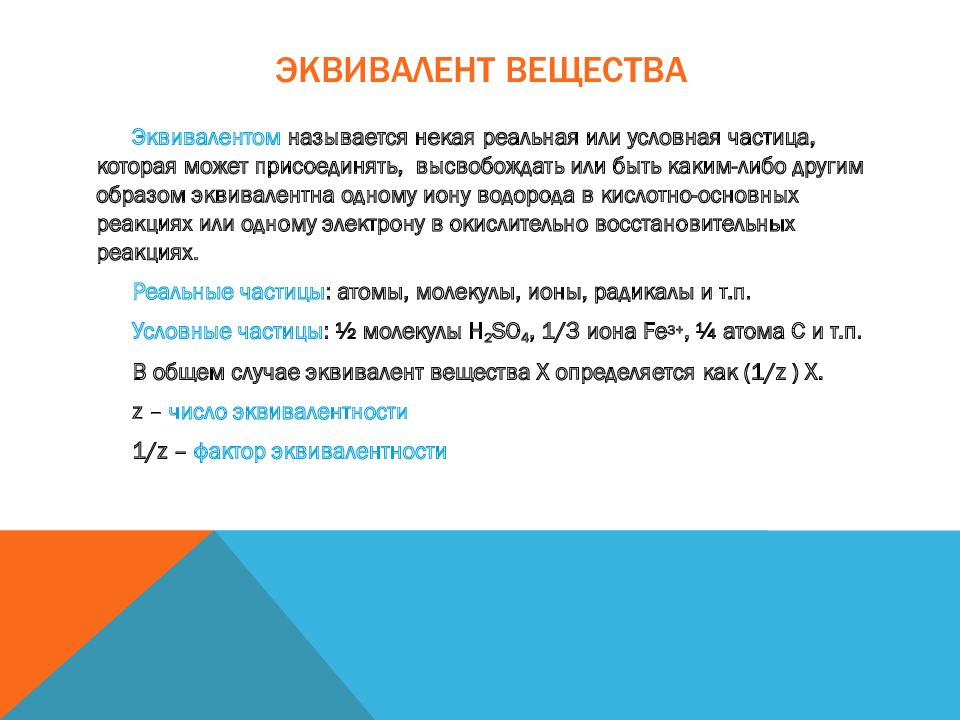 Эквивалентом называется некая реальная или условная частица, которая может присоединять, высвобождать или быть каким-либо другим образом эквивалентна одному иону водорода в кислотно-основных реакциях или одному электрону в окислительно восстановительных реакциях. Реальные частицы : атомы, молекулы, ионы, радикалы и т.п. Условные частицы : ½ молекулы H 2 SO 4, 1/3 иона Fe 3+, ¼ атома С и т.п. В общем случае эквивалент вещества Х определяется как ( 1/ z ) X. z – число эквивалентности 1/ z – фактор эквивалентности