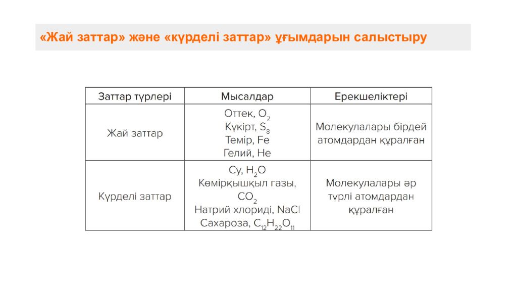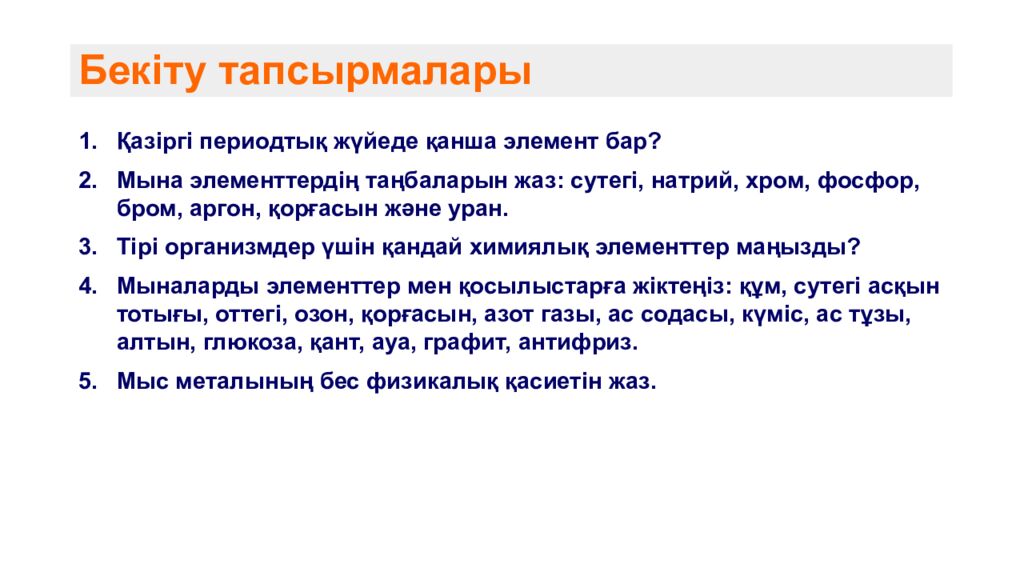 Последний слайд презентации: ХИМИЯЛЫҚ ЭЛЕМЕНТТЕР. ЖАЙ ЖӘНЕ КҮРДЕЛІ ЗАТТАР: Бекіту тапсырмалары