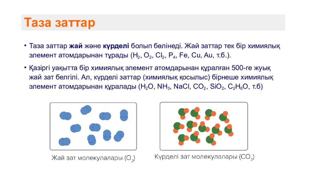 Таза заттар жай және күрделі болып бөлінеді. Жай заттар тек бір химиялық элемент атомдарынан тұрады ( H 2, O 2, Cl 2, P 4, Fe, Cu, Au, т.б.). Қазіргі уақытта бір химиялық элемент атомдарынан құралған 500-ге жуық жай зат белгілі. Ал, күрделі заттар (химиялық қосылыс) бірнеше химиялық элемент атомдарынан құралады ( H 2 O, NH 3, NaCl, CO 2, SiO 2, C 2 H 6 O, т.б)