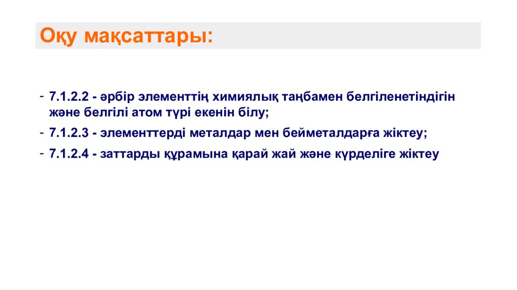 7.1.2.2 - әрбір элементтің химиялық таңбамен белгіленетіндігін және белгілі атом түрі екенін білу; 7.1.2.3 - элементтерді металдар мен бейметалдарға жіктеу; 7.1.2.4 - заттарды құрамына қарай жай және күрделіге жіктеу