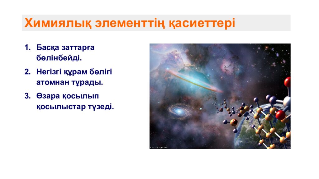 Басқа заттарға бөлінбейді. Негізгі құрам бөлігі атомнан тұрады. Өзара қосылып қосылыстар түзеді.