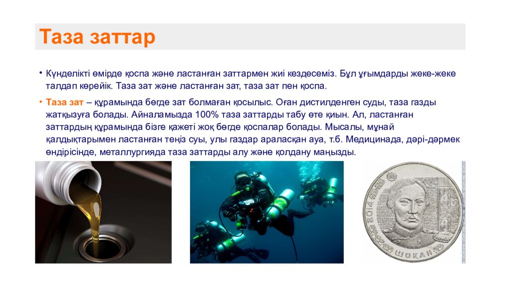 Күнделікті өмірде қоспа және ластанған заттармен жиі кездесеміз. Бұл ұғымдарды жеке-жеке талдап көрейік. Таза зат және ластанған зат, таза зат пен қоспа. Таза зат – құрамында бөгде зат болмаған қосылыс. Оған дистилденген суды, таза газды жатқызуға болады. Айналамызда 100% таза заттарды табу өте қиын. Ал, ластанған заттардың құрамында бізге қажеті жоқ бөгде қоспалар болады. Мысалы, мұнай қалдықтарымен ластанған теңіз суы, улы газдар араласқан ауа, т.б. Медицинада, дәрі-дәрмек өндірісінде, металлургияда таза заттарды алу және қолдану маңызды.