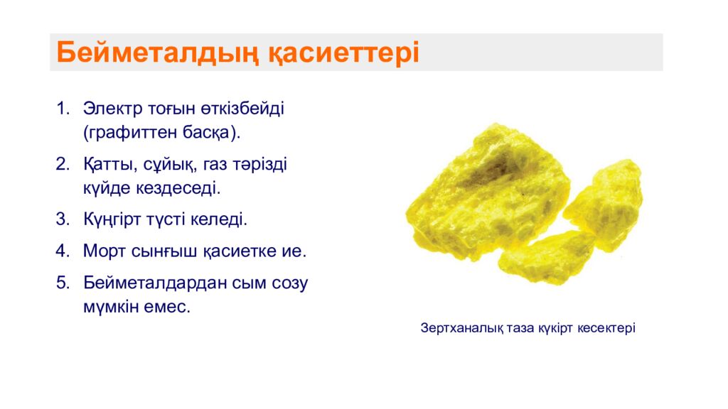 Электр тоғын өткізбейді (графиттен басқа). Қатты, сұйық, газ тәрізді күйде кездеседі. Күңгірт түсті келеді. Морт сынғыш қасиетке ие. Бейметалдардан сым созу мүмкін емес. Зертханалық таза күкірт кесектері