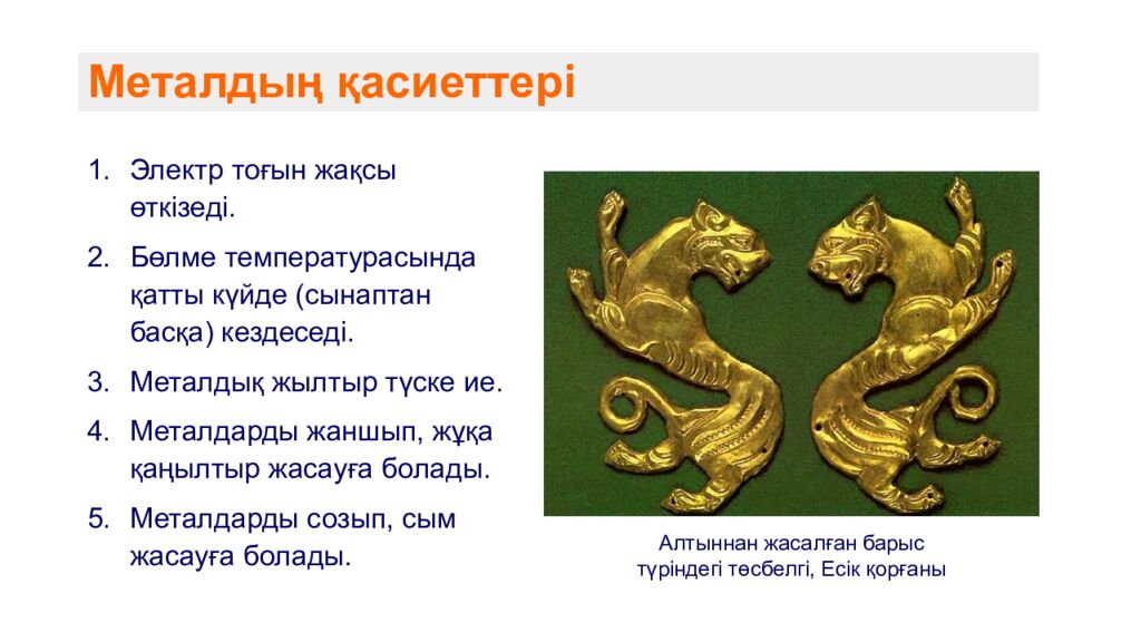 Электр тоғын жақсы өткізеді. Бөлме температурасында қатты күйде (сынаптан басқа) кездеседі. Металдық жылтыр түске ие. Металдарды жаншып, жұқа қаңылтыр жасауға болады. Металдарды созып, сым жасауға болады. Алтыннан жасалған барыс түріндегі төсбелгі, Есік қорғаны