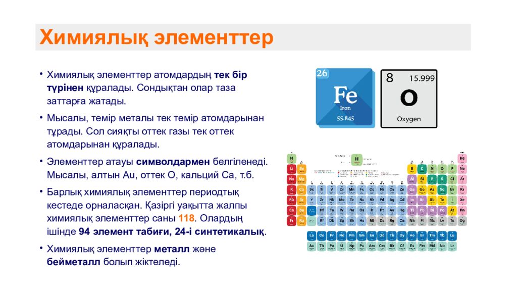Химиялық элементтер атомдардың тек бір түрінен құралады. Сондықтан олар таза заттарға жатады. Мысалы, темір металы тек темір атомдарынан тұрады. Сол сияқты оттек газы тек оттек атомдарынан құралады. Элементтер атауы символдармен белгіленеді. Мысалы, алтын Au, оттек О, кальций Ca, т.б. Барлық химиялық элементтер периодтық кестеде орналасқан. Қазіргі уақытта жалпы химиялық элементтер саны 118. Олардың ішінде 94 элемент табиғи, 24-і синтетикалық. Химиялық элементтер металл және бейметалл болып жіктеледі.