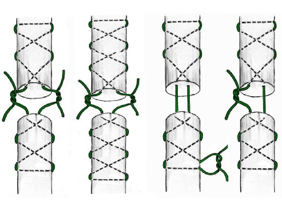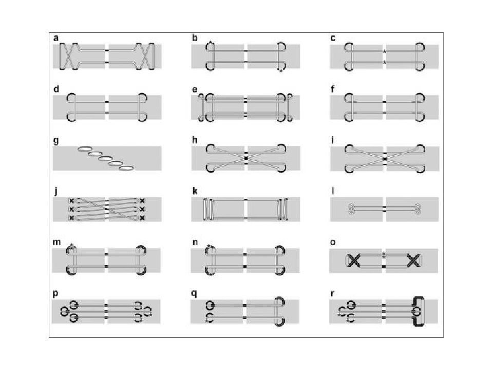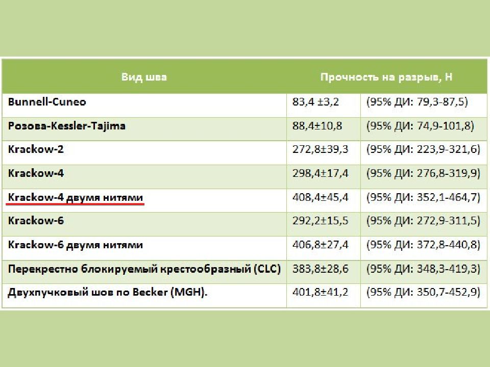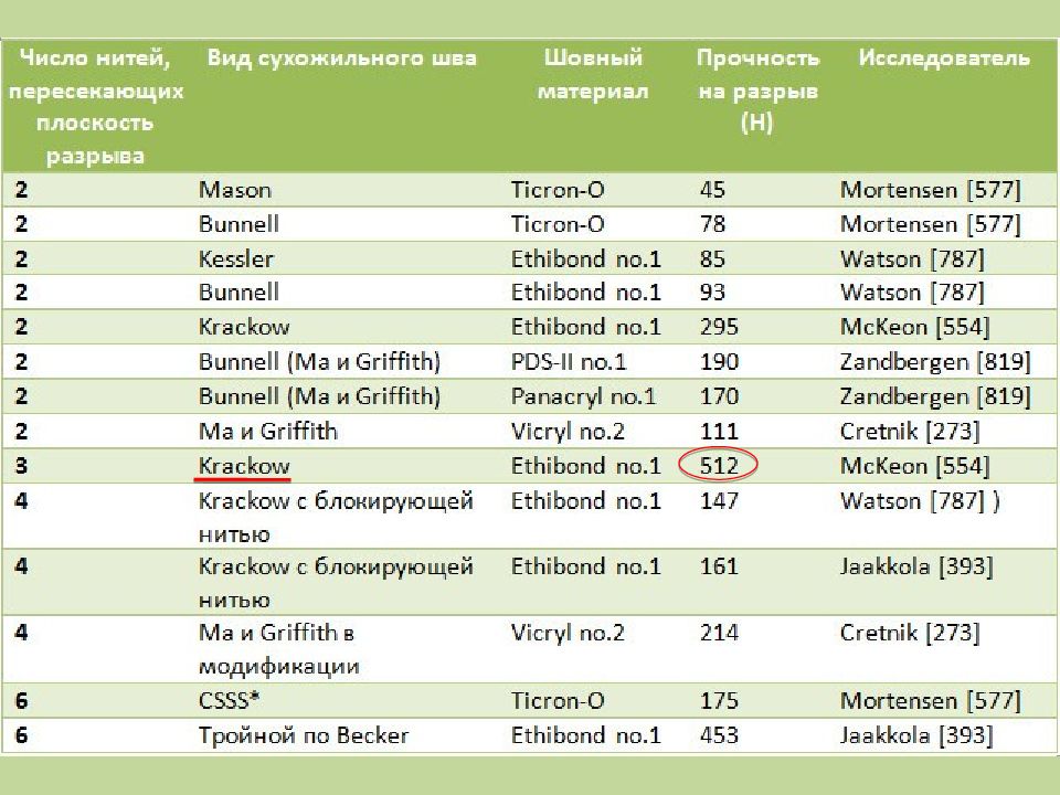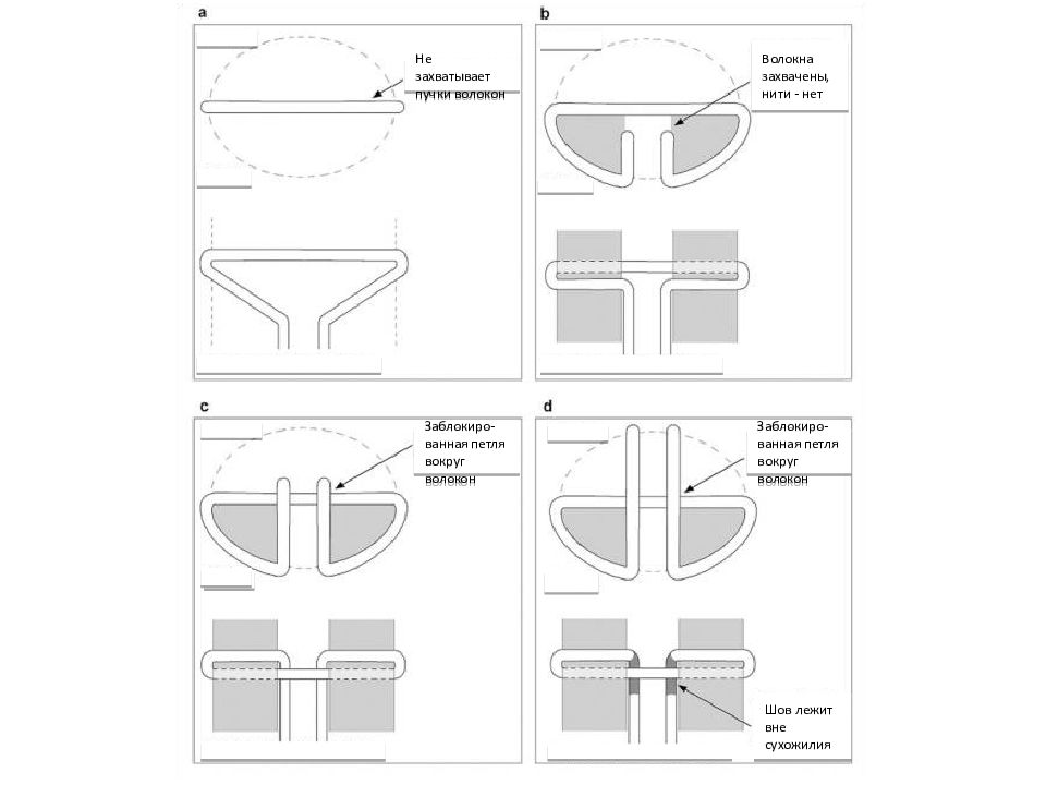 Не захватывает пучки волокон Волокна захвачены, нити - нет Заблокиро - ванная петля вокруг волокон Заблокиро - ванная петля вокруг волокон Шов лежит вне сухожилия