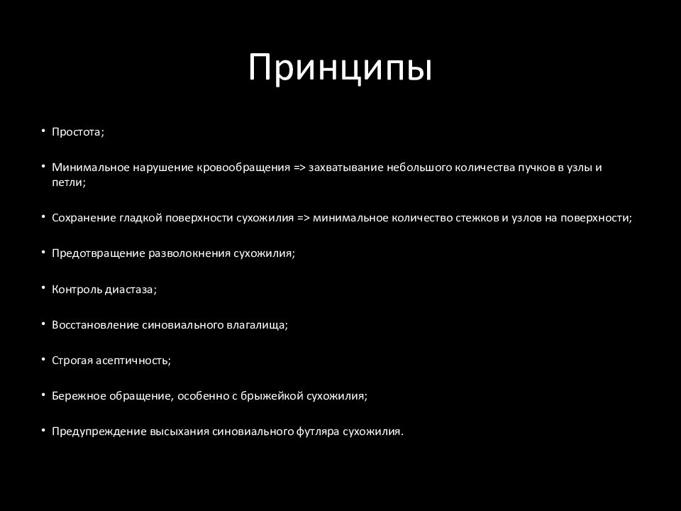 Простота; Минимальное нарушение кровообращения = > захватывание небольшого количества пучков в узлы и петли; Сохранение гладкой поверхности сухожилия = > минимальное количество стежков и узлов на поверхности; Предотвращение разволокнения сухожилия; Контроль диастаза ; Восстановление синовиального влагалища; Строгая асептичность ; Бережное обращение, особенно с брыжейкой сухожилия; Предупреждение высыхания синовиального футляра сухожилия.
