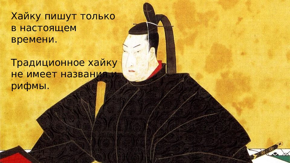 Хайку пишут только в настоящем времени. Традиционное хайку не имеет названия и рифмы.