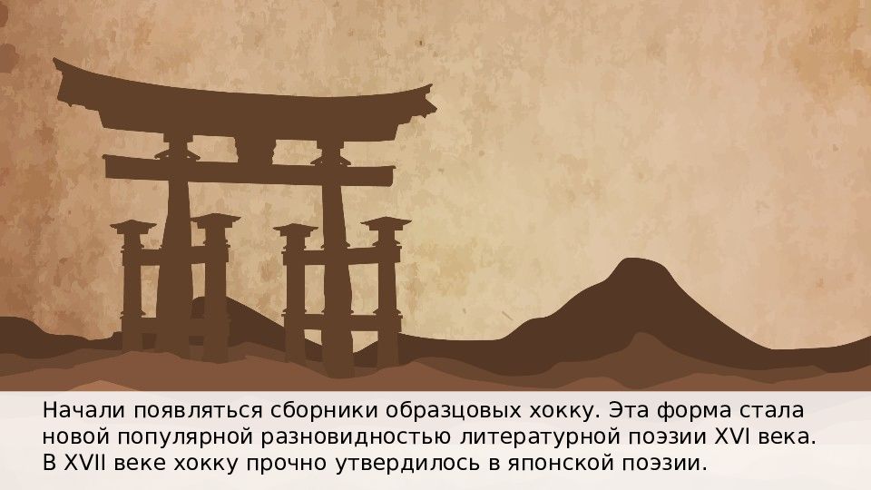 Начали появляться сборники образцовых хокку. Эта форма стала новой популярной разновидностью литературной поэзии XVI века. В XVII веке хокку прочно утвердилось в японской поэзии.