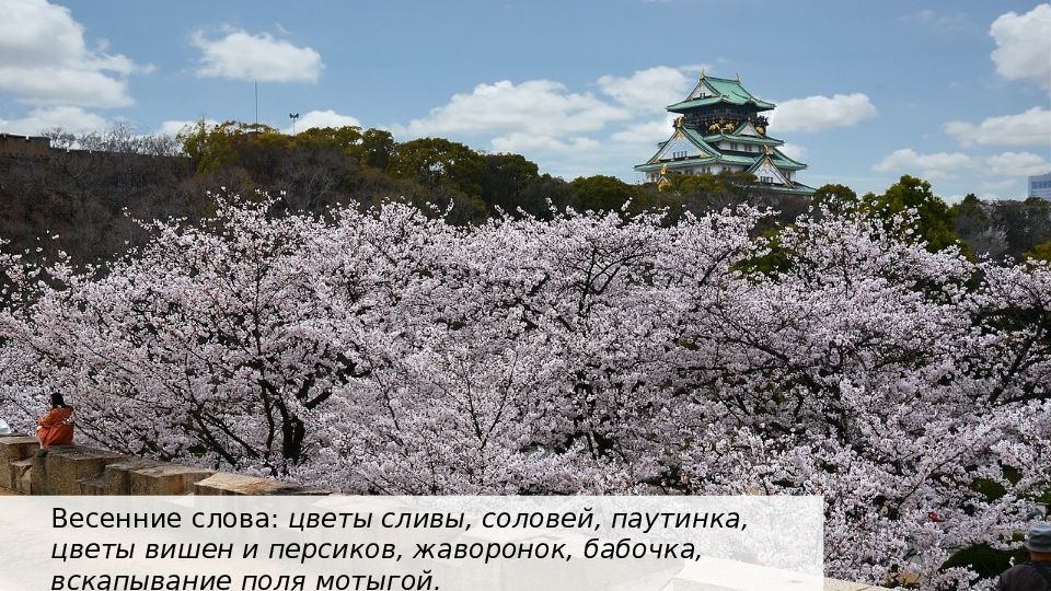 Весенние слова: цветы сливы, соловей, паутинка, цветы вишен и персиков, жаворонок, бабочка, вскапывание поля мотыгой.