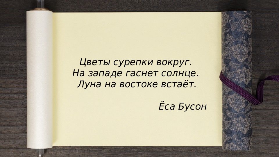 Цветы сурепки вокруг. На западе гаснет солнце. Луна на востоке встаёт. Ёса Бусон