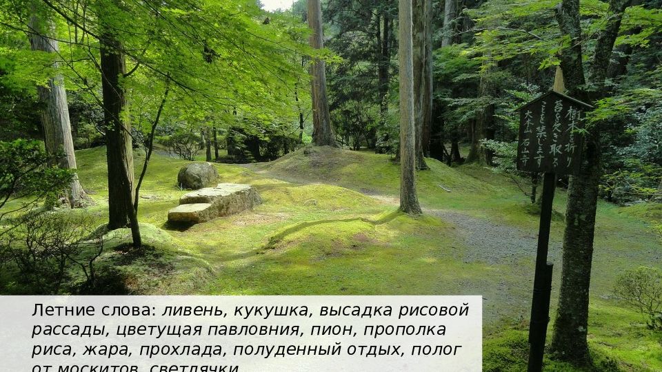 Летние слова: ливень, кукушка, высадка рисовой рассады, цветущая павловния, пион, прополка риса, жара, прохлада, полуденный отдых, полог от москитов, светлячки.