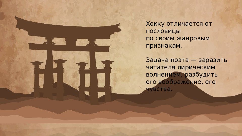 Хокку отличается от пословицы по своим жанровым признакам. Задача поэта — заразить читателя лирическим волнением, разбудить его воображение, его чувства.