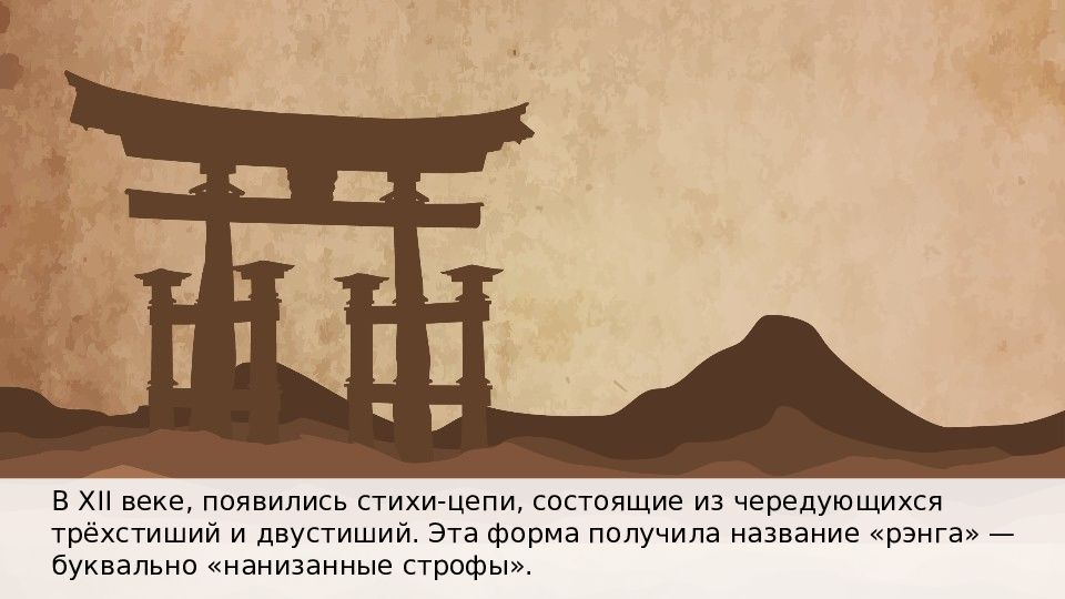 В Х II веке, появились стихи-цепи, состоящие из чередующихся трёхстиший и двустиший. Эта форма получила название « рэнга » — буквально «нанизанные строфы».
