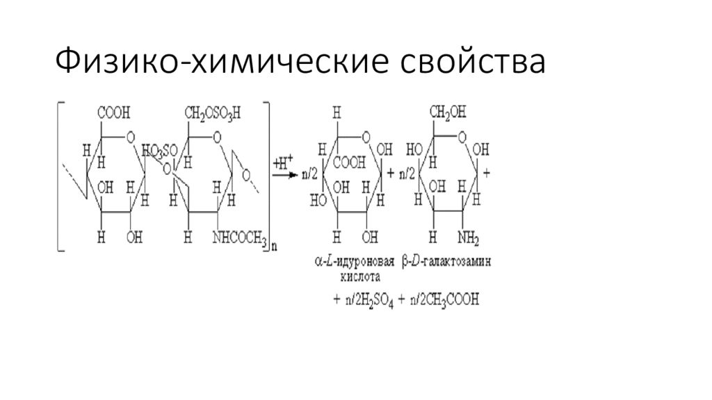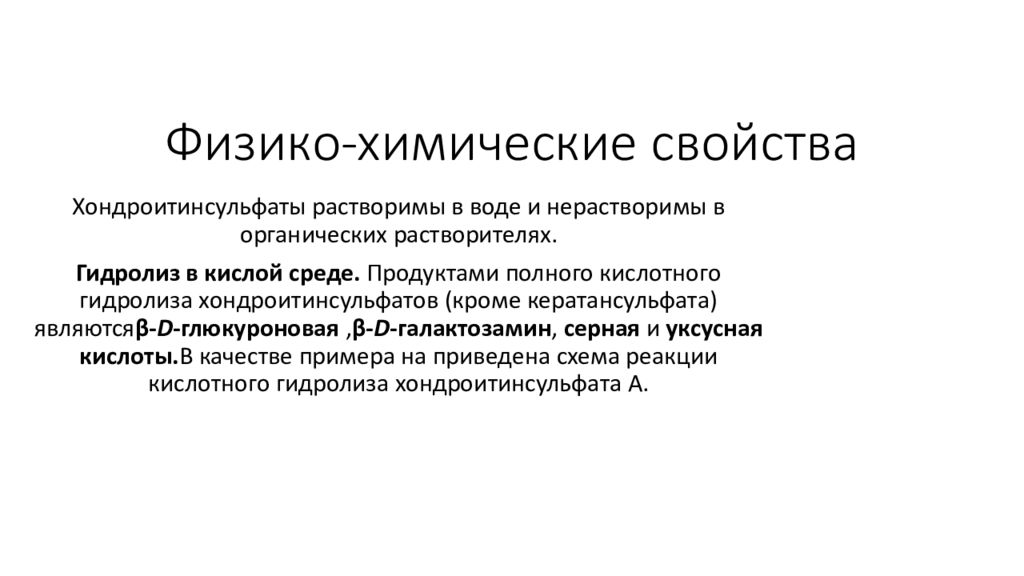 Хондроитинсульфаты растворимы в воде и нерастворимы в органических растворителях. Гидролиз в кислой среде. Продуктами полного кислотного гидролиза хондроитинсульфатов (кроме кератансульфата ) являются β- D - глюкуроновая , β- D - галактозамин, серная и уксусная кислоты. В качестве примера на приведена схема реакции кислотного гидролиза хондроитинсульфата А.