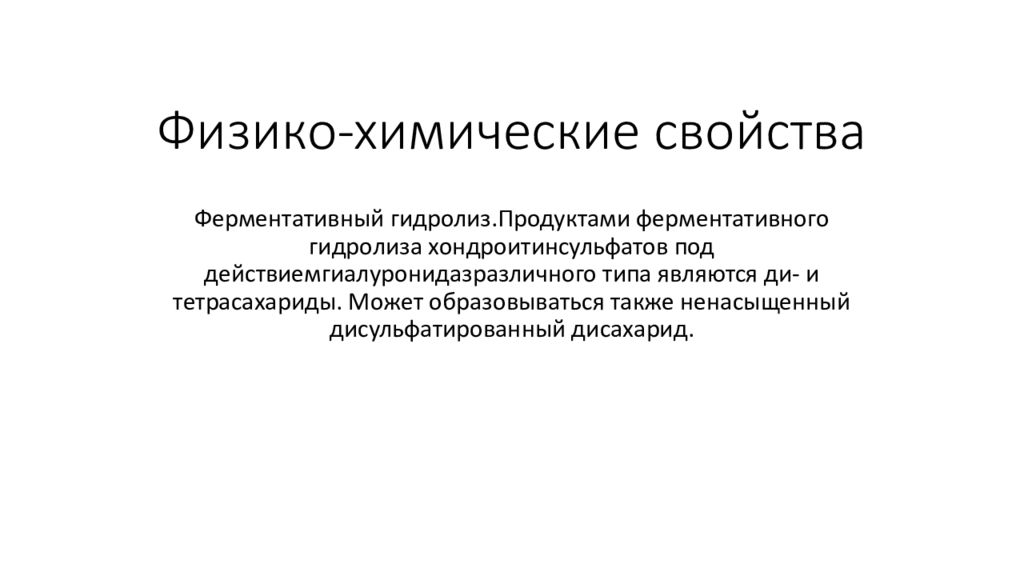 Ферментативный гидролиз.Продуктами ферментативного гидролиза хондроитинсульфатов под действиемгиалуронидазразличного типа являются ди - и тетрасахариды. Может образовываться также ненасыщенный дисульфатированный дисахарид.