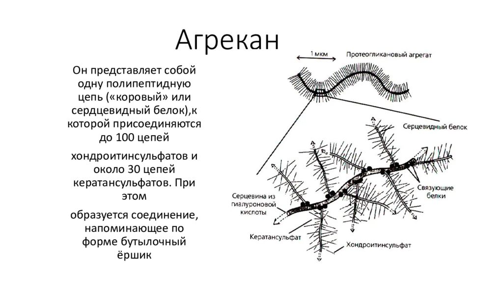 Он представляет собой одну полипептидную цепь (« коровый » или сердцевидный белок),к которой присоединяются до 100 цепей хондроитинсульфатов и около 30 цепей кератансульфатов. При этом образуется соединение, напоминающее по форме бутылочный ёршик