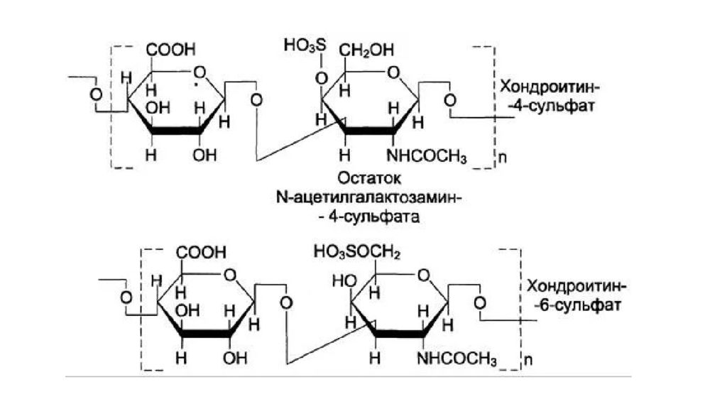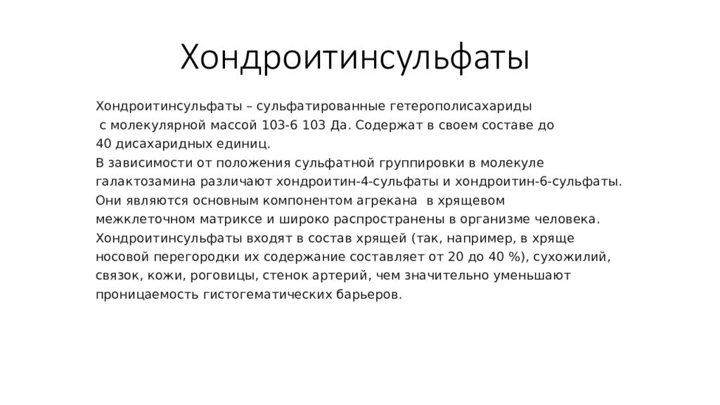 Хондроитинсульфаты – сульфатированные гетерополисахариды с молекулярной массой 103-6 103 Да. Содержат в своем составе до 40 дисахаридных единиц. В зависимости от положения сульфатной группировки в молекуле галактозамина различают хондроитин-4-сульфаты и хондроитин-6-сульфаты. Они являются основным компонентом агрекана в хрящевом межклеточном матриксе и широко распространены в организме человека. Хондроитинсульфаты входят в состав хрящей (так, например, в хряще носовой перегородки их содержание составляет от 20 до 40 %), сухожилий, связок, кожи, роговицы, стенок артерий, чем значительно уменьшают проницаемость гистогематических барьеров.