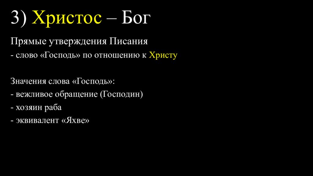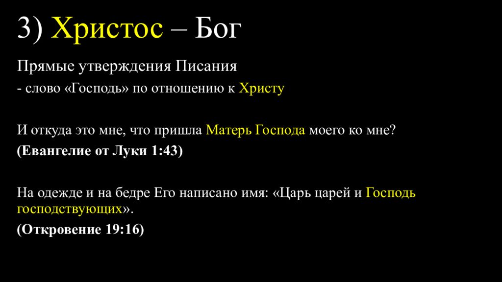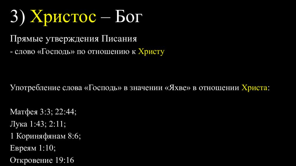 Прямые утверждения Писания - слово «Господь» по отношению к Христу Употребление слова «Господь» в значении «Яхве» в отношении Христа : Матфея 3:3; 22:44; Лука 1:43; 2:11; 1 Кориняфянам 8:6; Евреям 1:10; Откровение 19:16