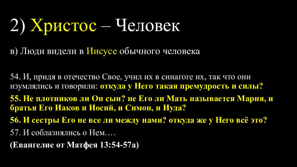 в) Люди видели в Иисусе обычного человека 54. И, придя в отечество Свое, учил их в синагоге их, так что они изумлялись и говорили: откуда у Него такая премудрость и силы? 55. Не плотников ли Он сын? не Его ли Мать называется Мария, и братья Его Иаков и Иосий, и Симон, и Иуда? 56. И сестры Его не все ли между нами? откуда же у Него всё это? 57. И соблазнялись о Нем…. (Евангелие от Матфея 13:54-57а)