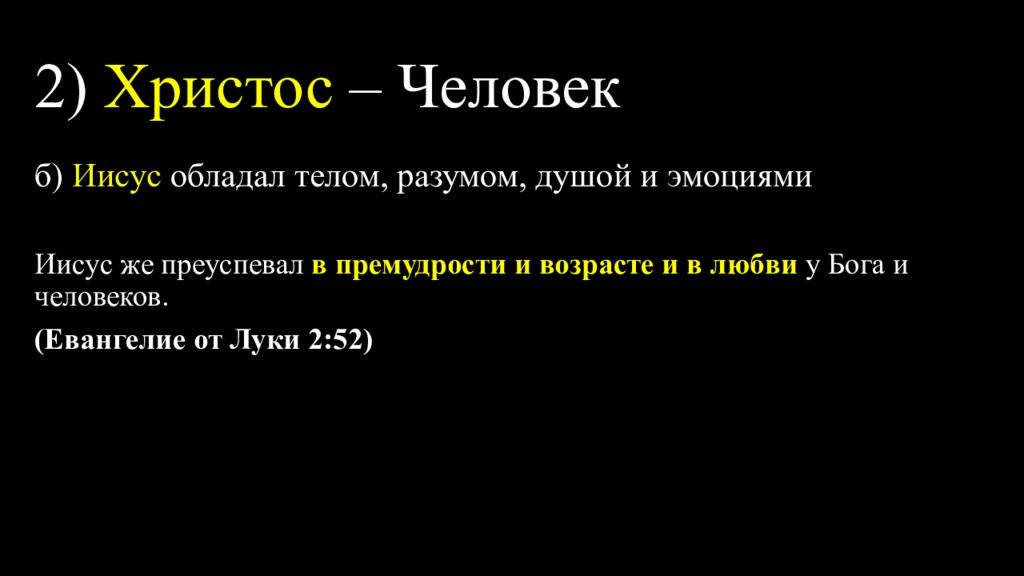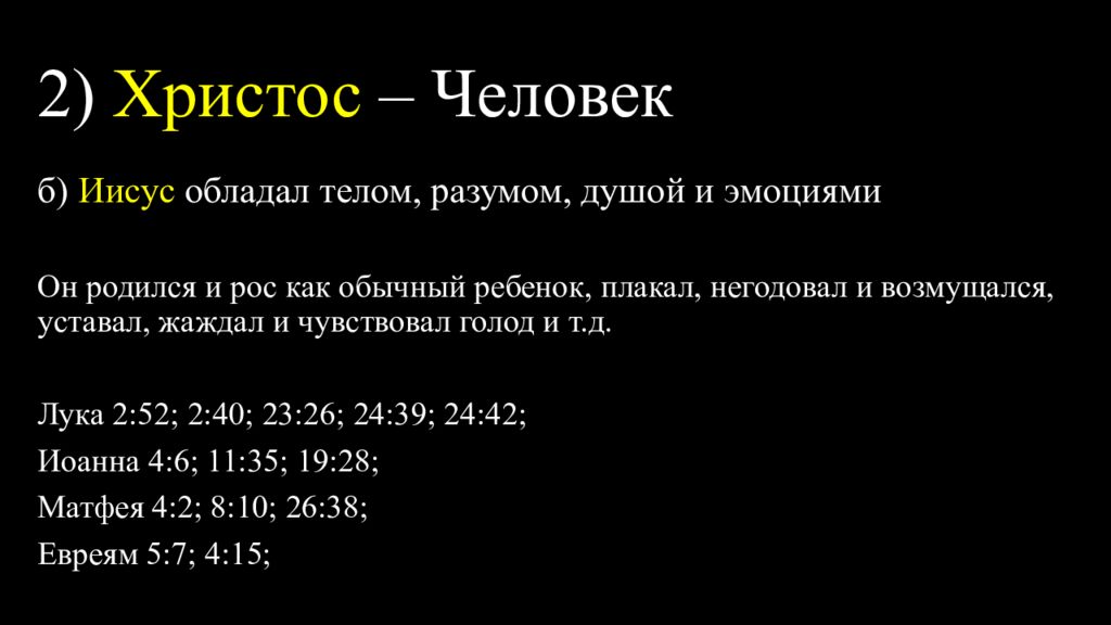 б) Иисус обладал телом, разумом, душой и эмоциями Он родился и рос как обычный ребенок, плакал, негодовал и возмущался, уставал, жаждал и чувствовал голод и т.д. Лука 2:52; 2:40; 23:26; 24:39; 24:42; Иоанна 4:6; 11:35; 19:28; Матфея 4:2; 8:10; 26:38; Евреям 5:7; 4:15;