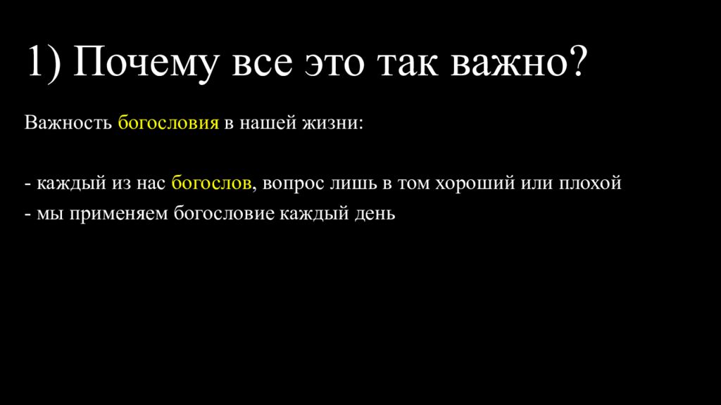 Важность богословия в нашей жизни : - каждый из нас богослов, вопрос лишь в том хороший или плохой - мы применяем богословие каждый день