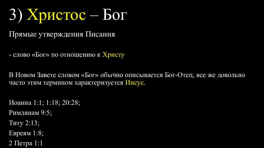 Прямые утверждения Писания - слово «Бог» по отношению к Христу В Новом Завете словом «Бог» обычно описывается Бог-Отец, все же довольно часто этим термином характеризуется Иисус. Иоанна 1:1; 1:18; 20:28; Римлянам 9:5; Титу 2:13; Евреям 1:8; 2 Петра 1:1