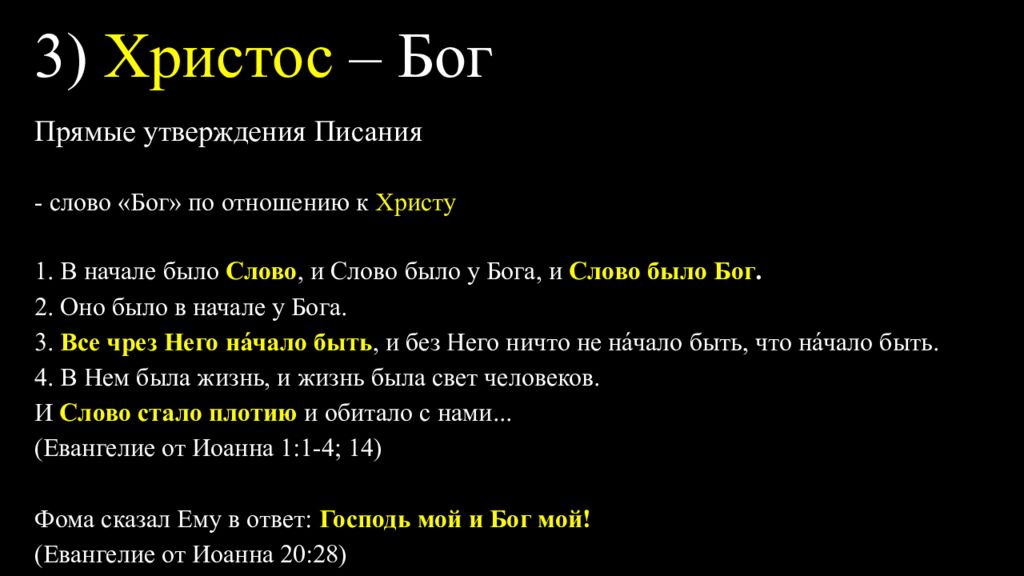 Прямые утверждения Писания - слово «Бог» по отношению к Христу 1. В начале было Слово, и Слово было у Бога, и Слово было Бог. 2. Оно было в начале у Бога. 3. Все чрез Него на́чало быть, и без Него ничто не на́чало быть, что на́чало быть. 4. В Нем была жизнь, и жизнь была свет человеков. И Слово стало плотию и обитало с нами... (Евангелие от Иоанна 1:1-4; 14) Фома сказал Ему в ответ: Господь мой и Бог мой! (Евангелие от Иоанна 20:28)