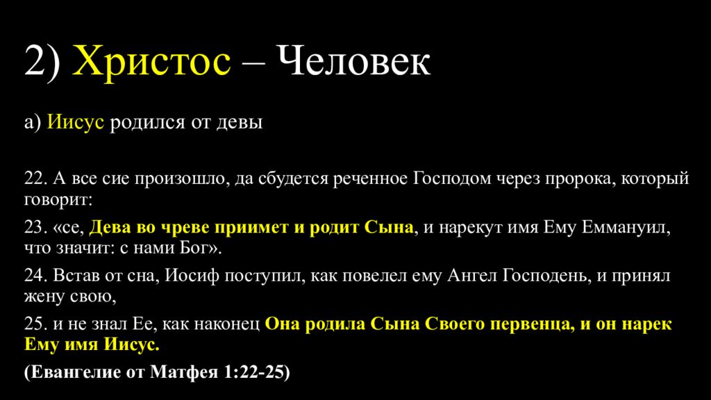 а) Иисус родился от девы 22. А все сие произошло, да сбудется реченное Господом через пророка, который говорит: 23. «се, Дева во чреве приимет и родит Сына, и нарекут имя Ему Еммануил, что значит: с нами Бог». 24. Встав от сна, Иосиф поступил, как повелел ему Ангел Господень, и принял жену свою, 25. и не знал Ее, как наконец Она родила Сына Своего первенца, и он нарек Ему имя Иисус. (Евангелие от Матфея 1:22-25)