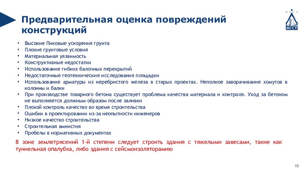 10 Высокие Пиковые ускорения грунта Плохие грунтовые условия Материальная уязвимость Конструктивные недостатки Использование гибких балочных перекрытий Недостаточные геотехнические исследования площадки Использование арматуры из неребристого железа в старых проектах. Неполное заворачивание хомутов в колонны и балки При производстве товарного бетона существует проблема качества материала и контроля. Уход за бетоном не выполняется должным образом после заливки Плохой контроль качество во время строительства Ошибки в проектировании из-за неопытности инженеров Низкое качество строительства Строительная амнистия Пробелы в нормативных документах В зоне землетрясений 1-й степени следует строить здания с тяжелыми завесами, такие как туннельная опалубка, либо здания с сейсмоизоляторамию