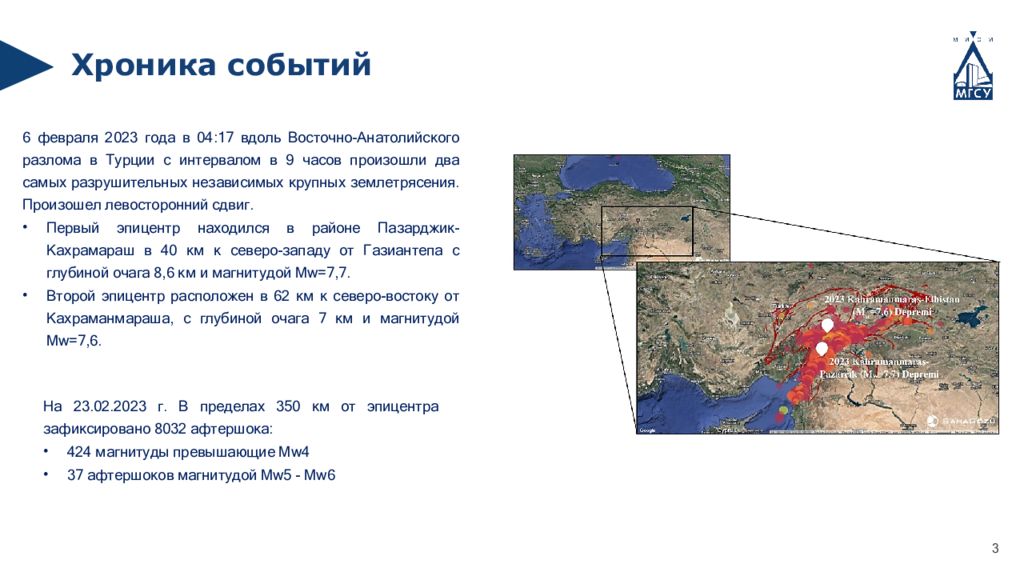3 6 февраля 2023 года в 04 :17 вдоль Восточно-Анатолийского разлома в Турции с интервалом в 9 часов произошли два самых разрушительных независимых крупных землетрясения. Произошел левосторонний сдвиг. Первый эпицентр находился в районе Пазарджик-Кахрамараш в 40 км к северо-западу от Газиантепа с глубиной очага 8,6 км и магнитудой Mw=7,7. Второй эпицентр расположен в 62 км к северо-востоку от Кахраманмараша, с глубиной очага 7 км и магнитудой Mw=7, 6. На 23.02.2023 г. В пределах 350 км от эпицентра зафиксировано 8032 афтершока : 424 магнитуды превышающие Mw4 37 афтершоков магнитудой Mw 5 - Mw 6