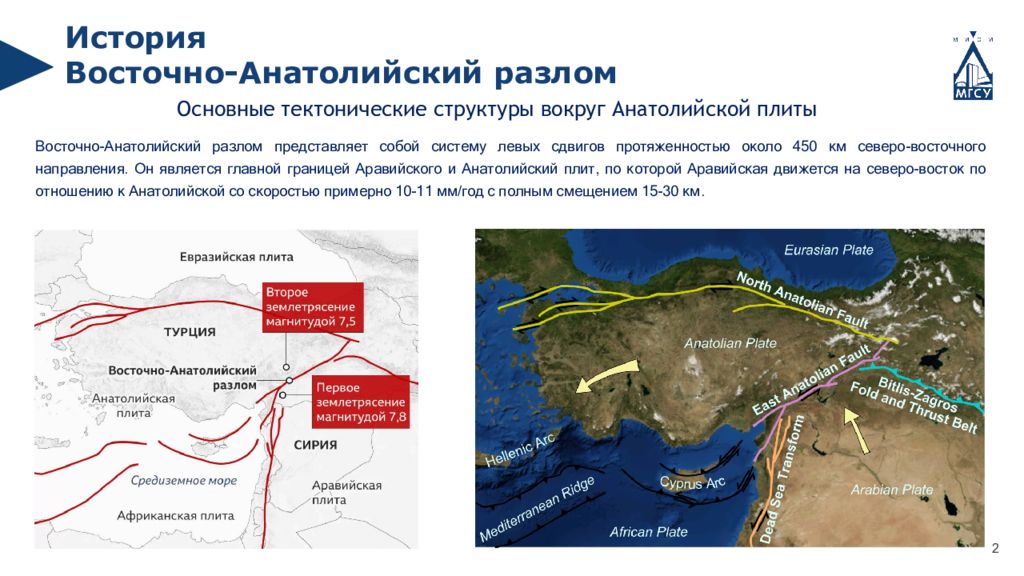 2 Основные тектонические структуры вокруг Анатолийской плиты Восточно-Анатолийский разлом представляет собой систему левых сдвигов протяженностью около 450 км северо-восточного направления. Он является главной границей Аравийского и Анатолийский плит, по которой Аравийская движется на северо-восток по отношению к Анатолийской со скоростью примерно 10-11 мм / год с полным смещением 15-30 км.