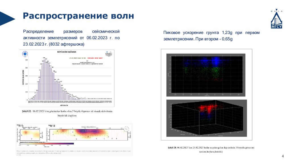 4 Распространение волн Пиковое ускорение грунта 1,23 g при первом землетрясении. При втором - 0,65 g Распределение размеров сейсмической активности землетрясений от 06.02.2023 г. по 23.02.2023 г. (8032 афтершока )
