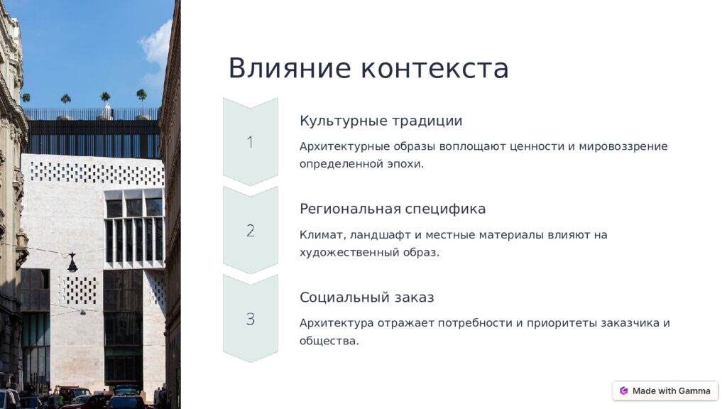 Влияние контекста Культурные традиции Архитектурные образы воплощают ценности и мировоззрение определенной эпохи. Региональная специфика Климат, ландшафт и местные материалы влияют на художественный образ. Социальный заказ Архитектура отражает потребности и приоритеты заказчика и общества.