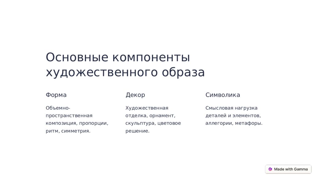 Основные компоненты художественного образа Форма Объемно-пространственная композиция, пропорции, ритм, симметрия. Декор Художественная отделка, орнамент, скульптура, цветовое решение. Символика Смысловая нагрузка деталей и элементов, аллегории, метафоры.